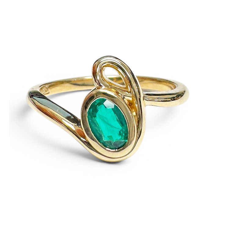 10K Yellow Gold - 0.26ct - Oval Cut Emerald Bezel Set EWJ Love Loop Ring featuring a natural oval cut emerald weighing - 0.26ct