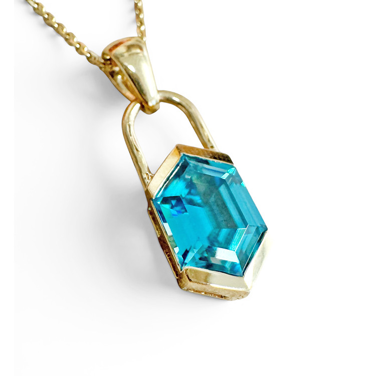 14K Yellow Gold - EWJ Custom - Blue Zircon Bezel Set Pendant featuring a premium Kimberly Collins 3.61ct Kite Cut Blue Zircon gem with hand set heavy gold bezel setting. 18 inch gold chain included.
